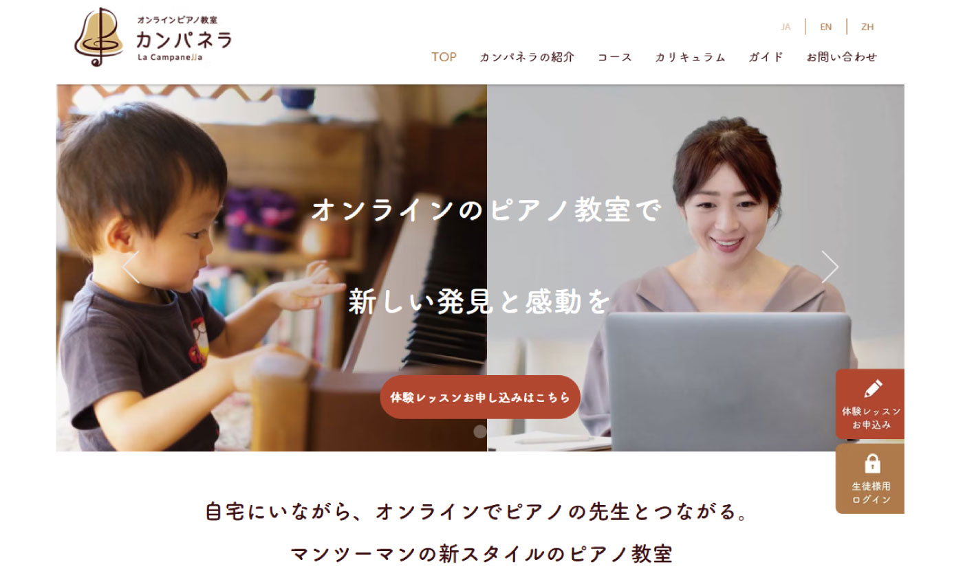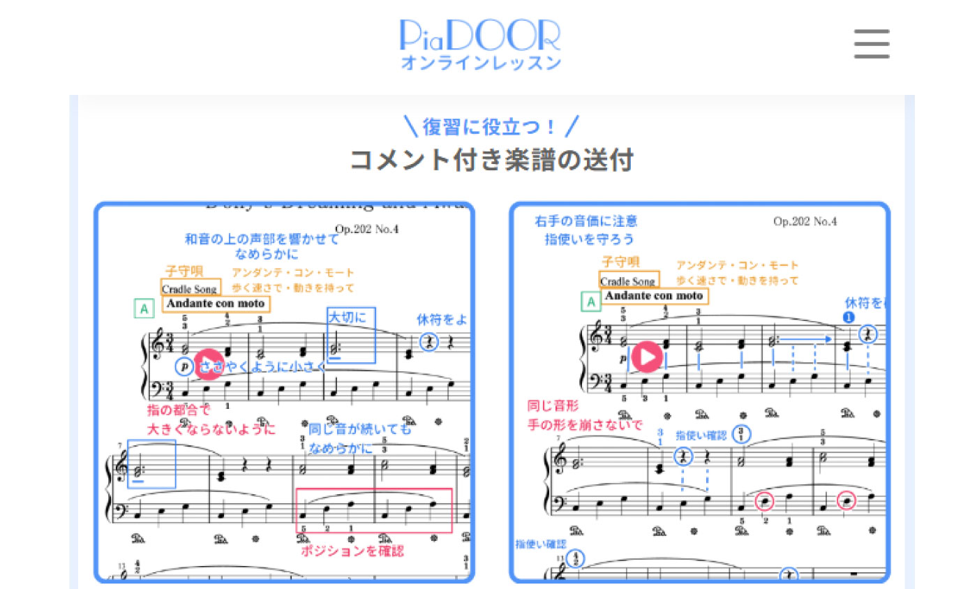 ・ピアノのオンラインレッスン専門 ・都度予約と自動予約あり ・毎レッスン後のレッスンメモやレッスン楽譜等送付 |