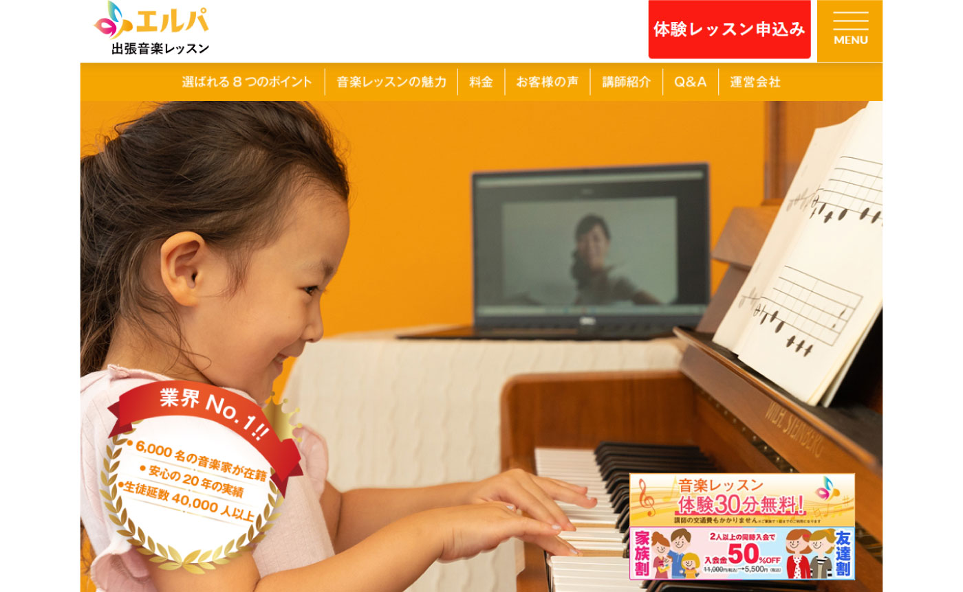 ・講師ごとに詳細なプロフィールや口コミを確認可能 ・オンライン音楽発表会やイベントあり(参加は自由) |