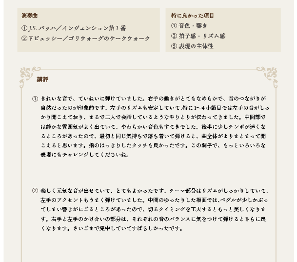 音楽的な感性と、長年の指導経験に基づく「確かな眼」で、演奏の本質を捉えます。