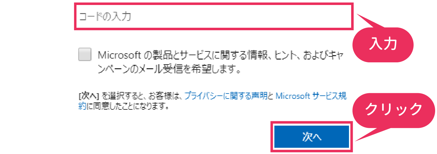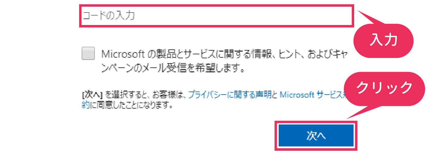 確認したら先程のコード入力画面にコードを入力し、「次へ」をクリックします。