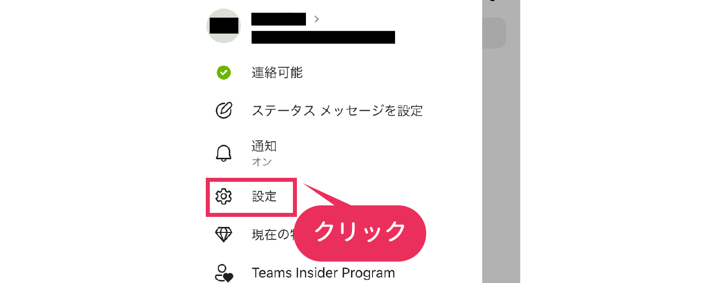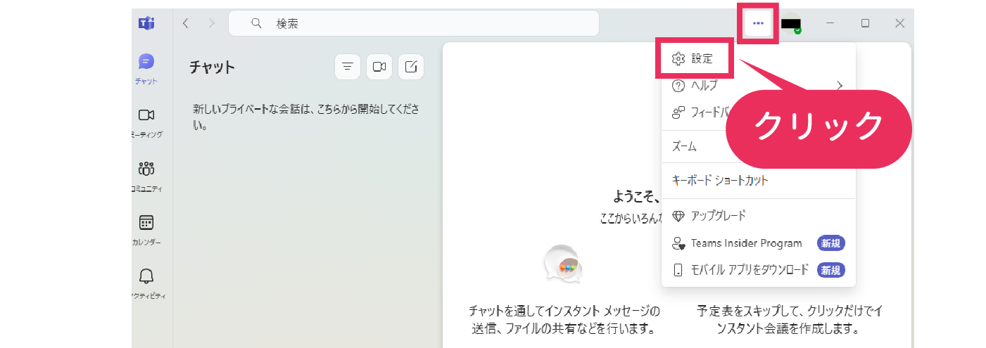 Microsoft Teams画面の右上にある三点リーダー(⋯)をクリックし、「設定」をクリックします。