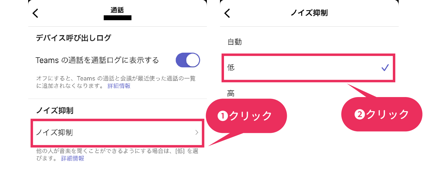通話メニューの「ノイズ抑制」をクリックし、「低」に設定してください。 「自動」「高」では、ピアノの音が正しく相手に届かない場合があります。