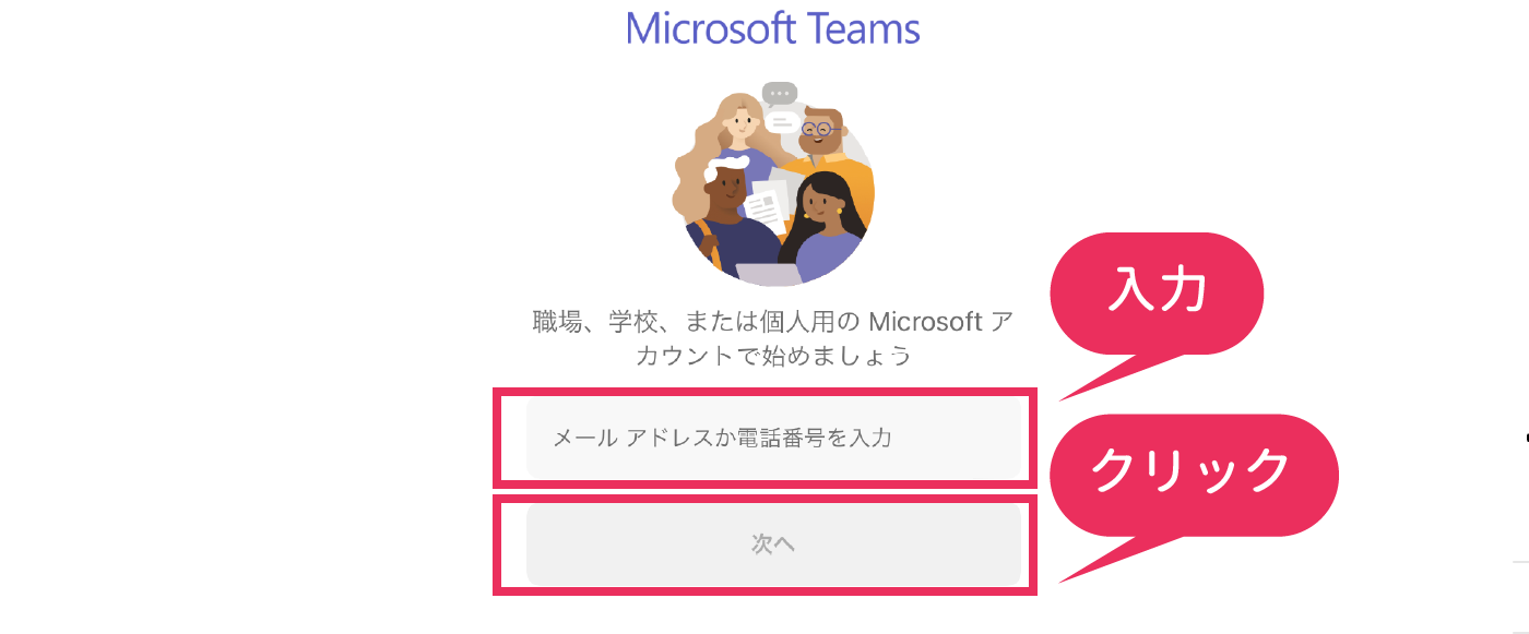 インストールが終わり、アプリを開くとMicrosoft Teamsのスタート画面が出てくるので、Microsoftアカウントで使用しているメールアドレスを入力して「次へ」をクリックします。