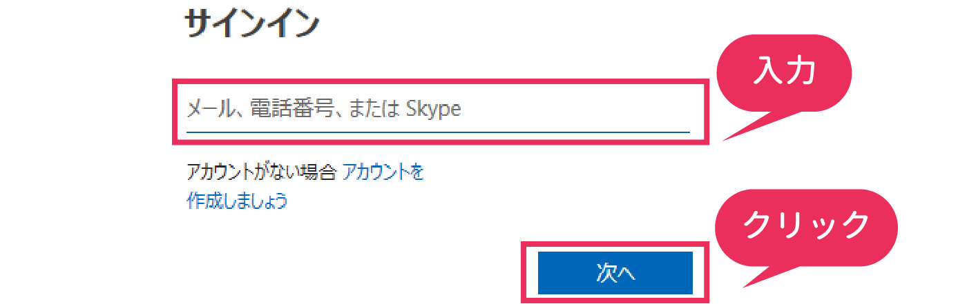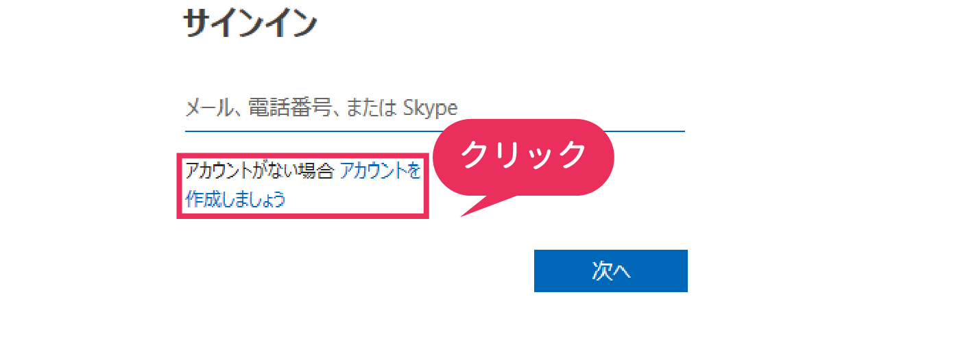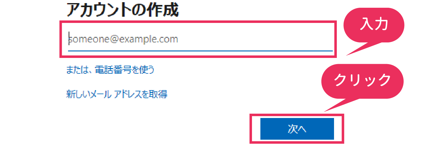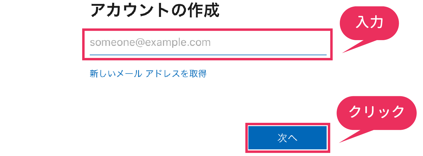 するとアカウントの作成画面に移ります。ご自分のメールアドレスを入力して「次へ」をクリックします。 GmailやYahooメールでもOKです。または「新しいメールアドレスを取得」を選んで @outlook.jp のアドレスを作成します。