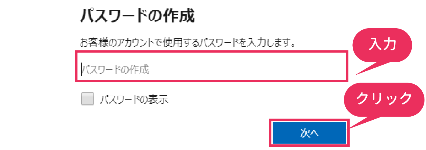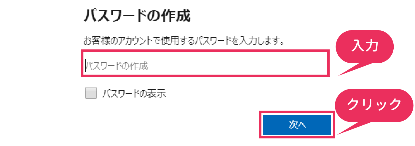 次にパスワード作成画面が出てくるので、パスワードを決めて入力し、「次へ」をクリックします。