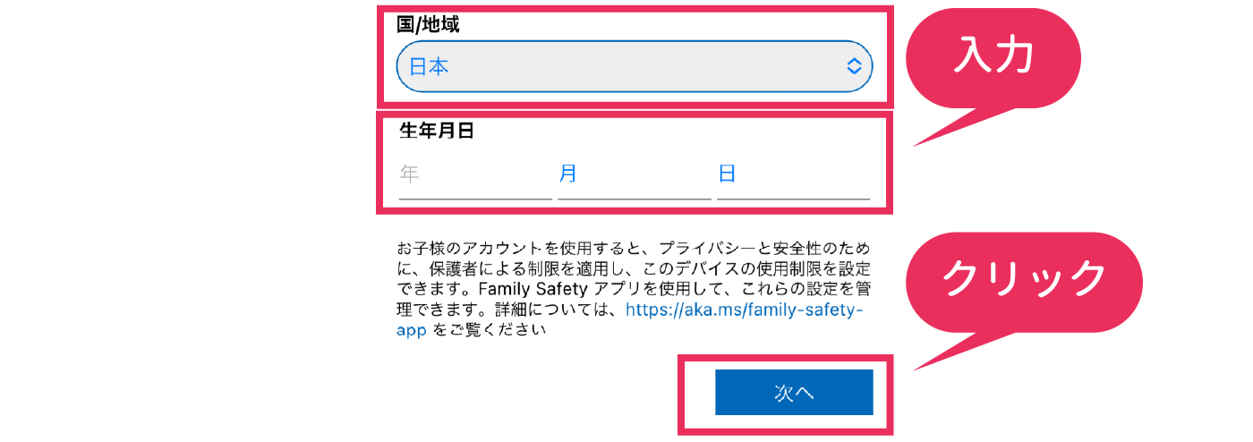 国/地域と生年月日を入力し、「次へ」をクリックします。