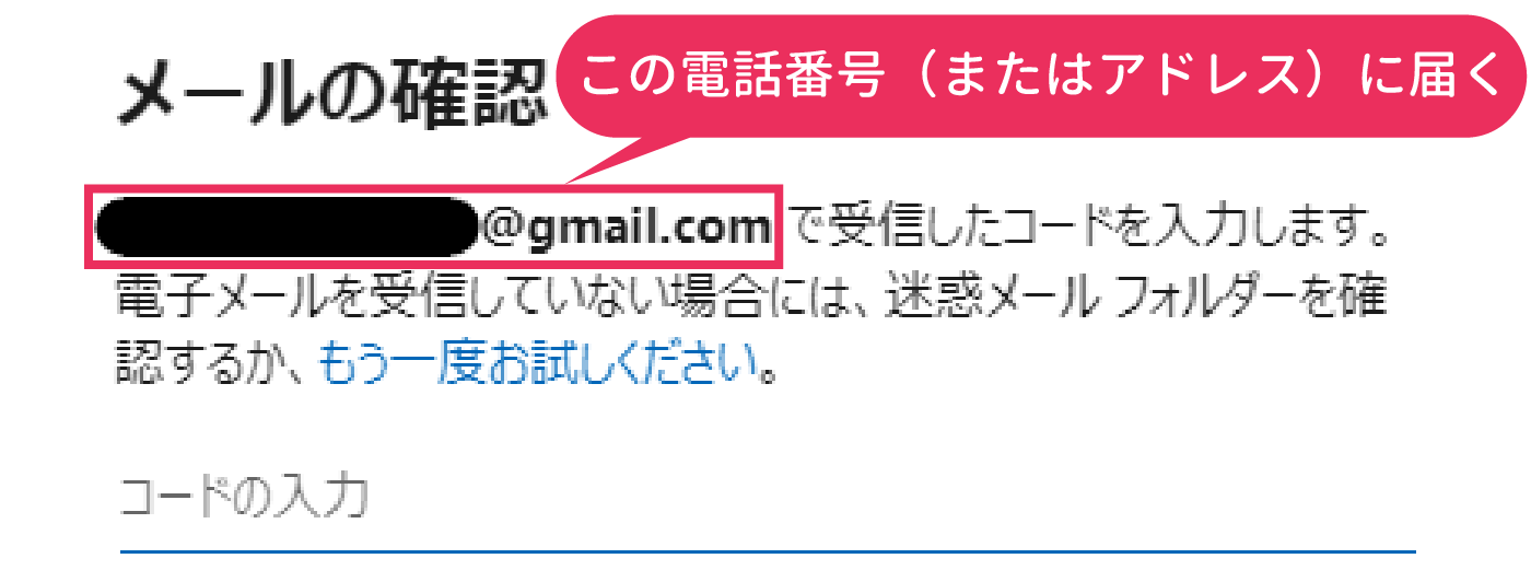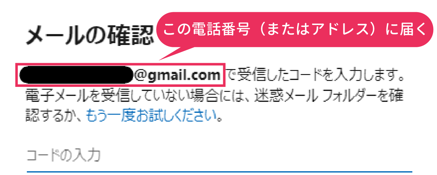 続いて、コードの入力画面が出てきます。先程のアカウント作成画面で