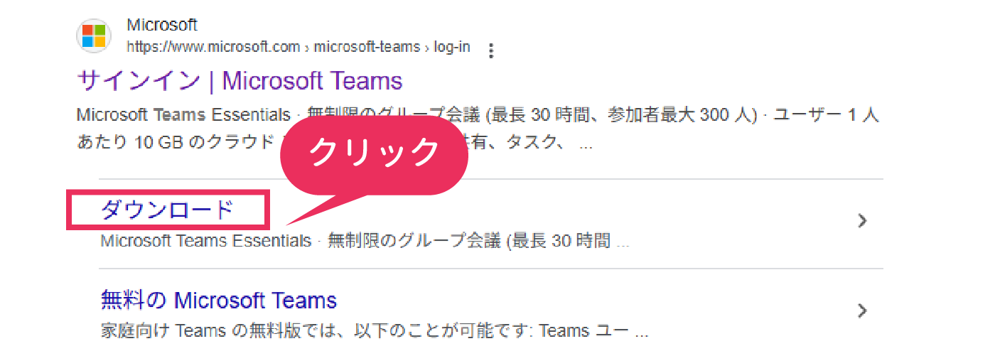 まず、ブラウザでTeamsと検索し、Teamsのダウンロードページを開きます。