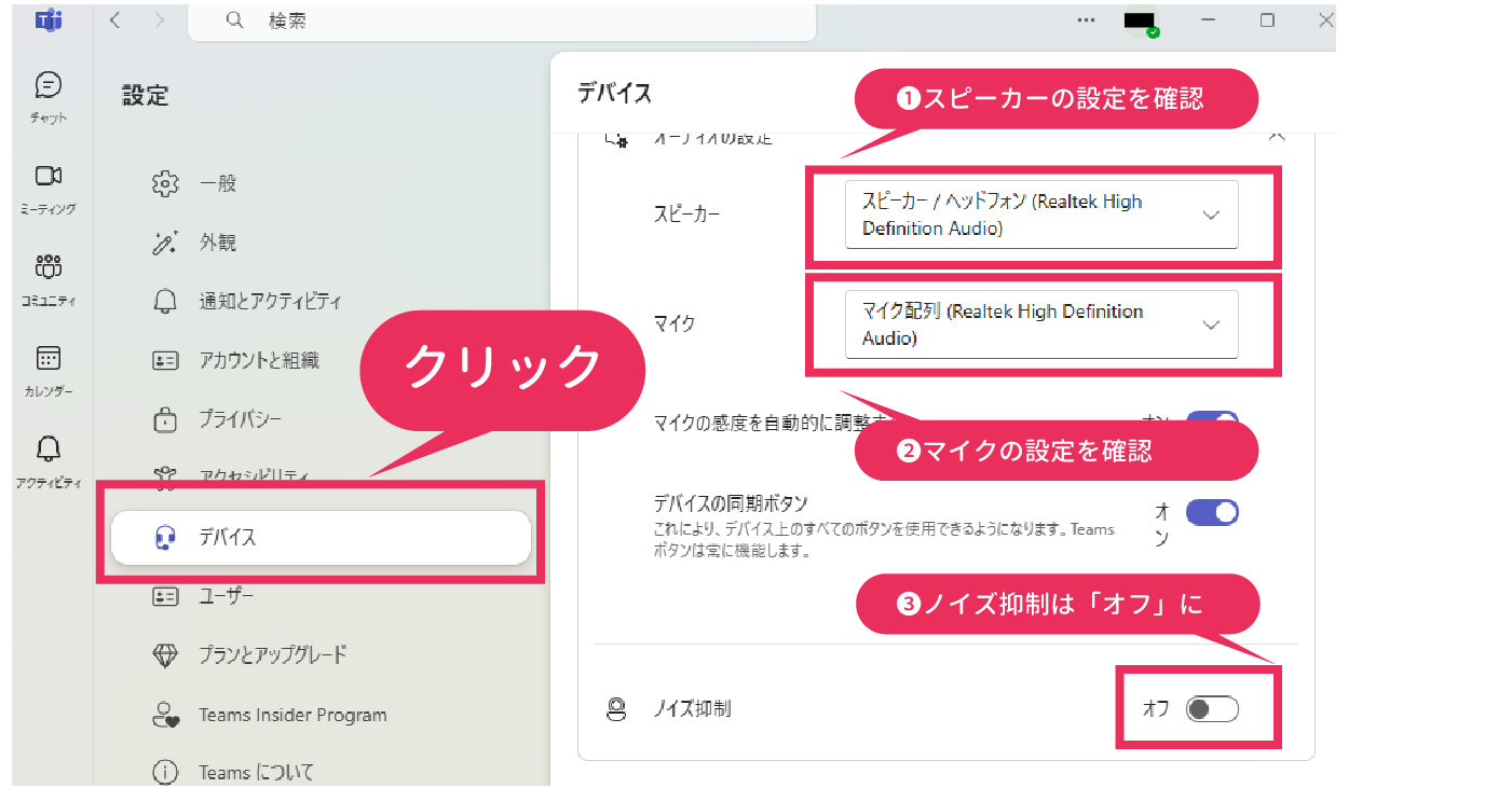 3.「ノイズ抑制」が「オフ」になっていること。オンのままだと、ピアノの音が正しく相手に届かない場合があります。