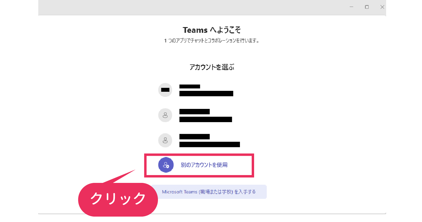インストールが終わるとMicrosoft Teamsの画面が出てくるので、Midrosoftアカウントをお持ちの方は使用するアカウントをクリックし、「❼マイクとカメラの確認」へ進んで下さい。