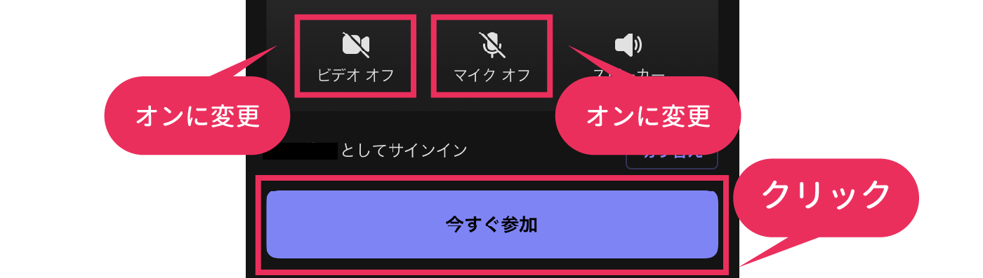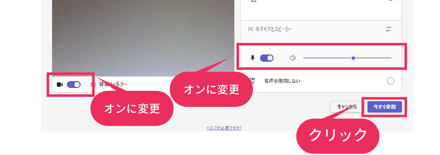 PCの場合は、カメラとマイクの利用を「オン」に設定して、「今すぐ参加」をクリックすると、レッスン講師に繋がります。