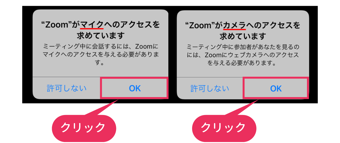 「Zoomがカメラへのアクセスを求めています」「Zoomがマイクへのアクセスを求めています」と表示されるので、「はい」とクリックしてください。