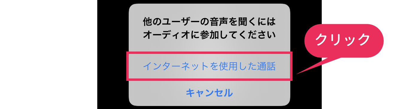 「他のユーザーの音声を聞くにはオーディオに参加してください」と表示されるので、「インターネットを使用した通話」というボタンをクリックします。