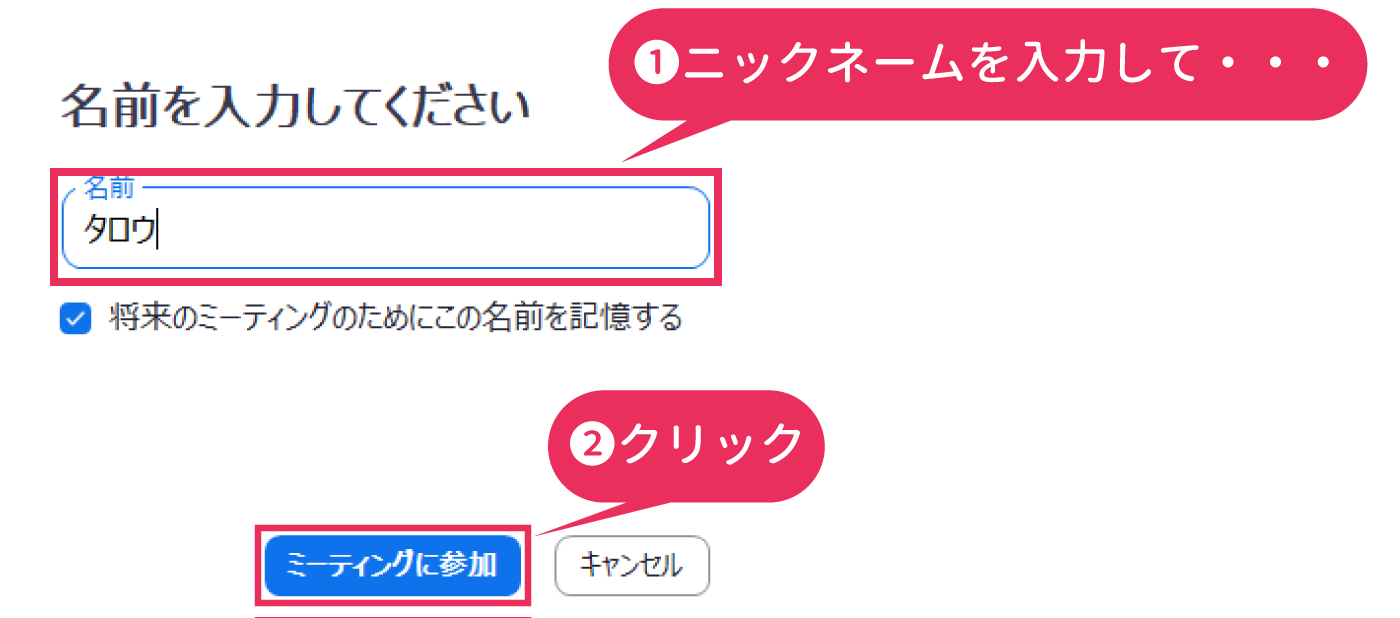 名前を聞かれるので「ニックネーム」を入力し、「ミーティングに参加」をクリックします。