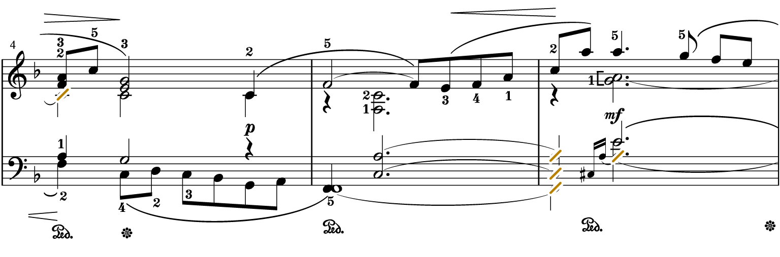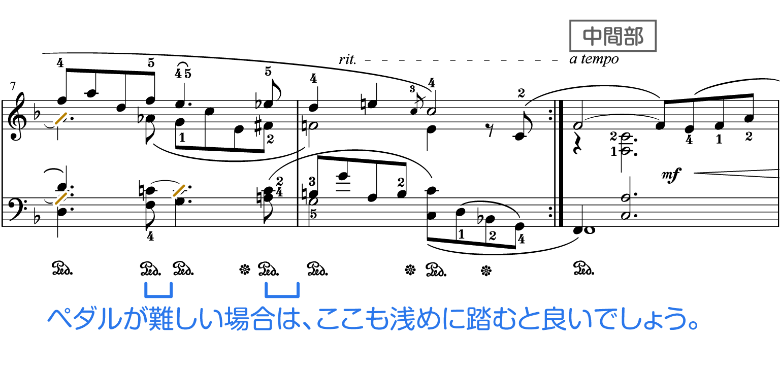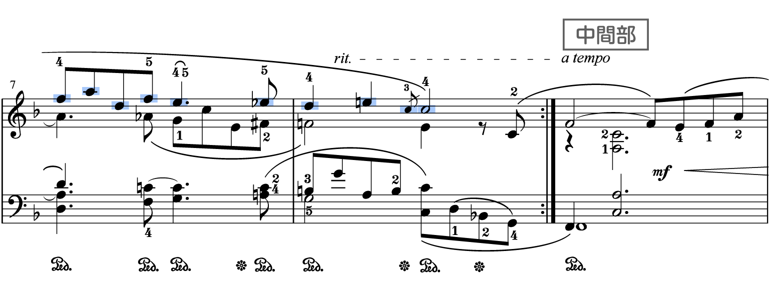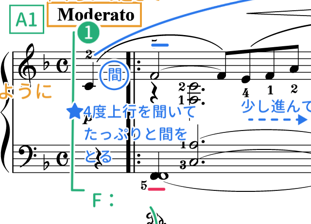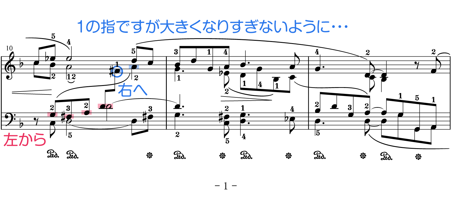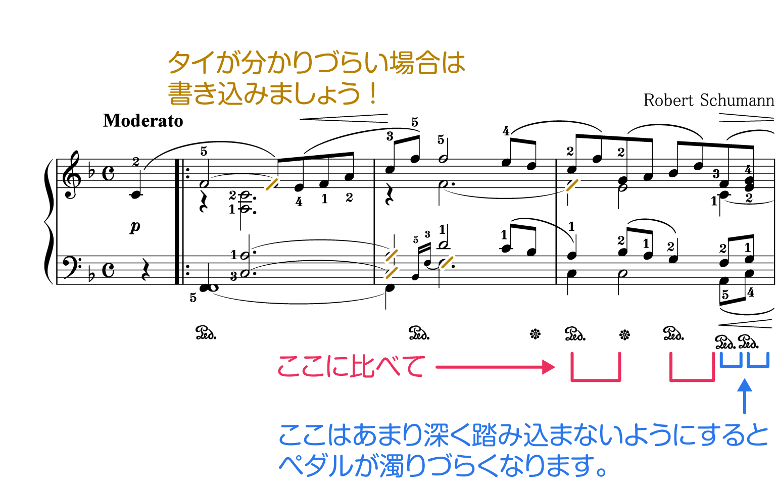 また、この曲はタイとスラーが多くて分かりづらいので、タイの音に斜線を引いておくと分かりやすいかもしれません。