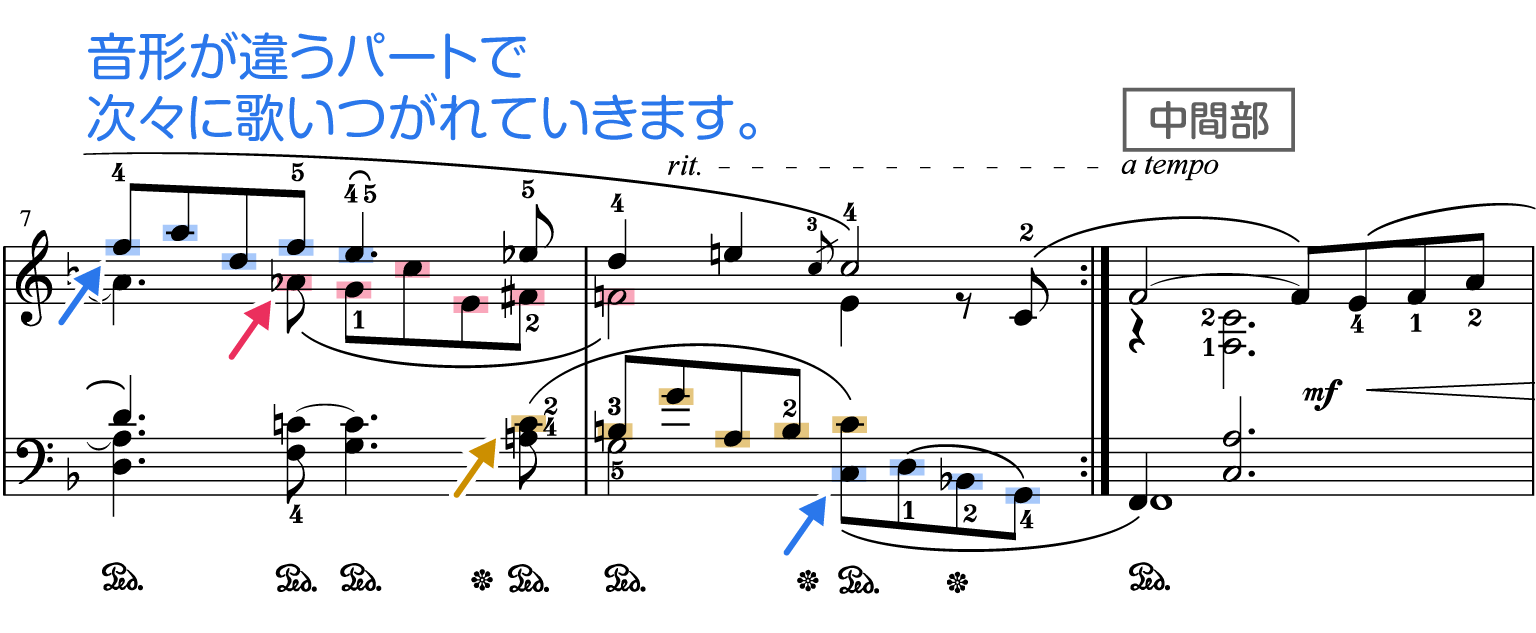 左から右へフレーズを受け渡したり、右から左へフレーズを受け渡すところがあります。