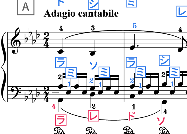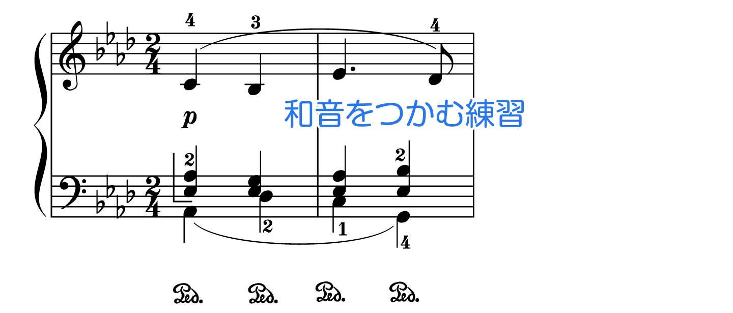 手の形(和音のつかみ)を覚えたり、和音の移り変わりを感じるために、和音だけ弾く練習も良いです。