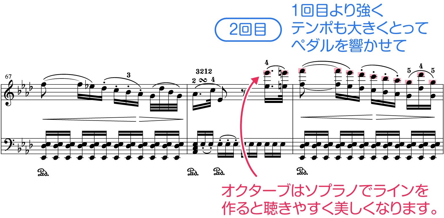オクターブを弾く時に、上の音が出たり下の音が出たりバラバラになってしまうと、あまり美しく聴こえないかもしれません。