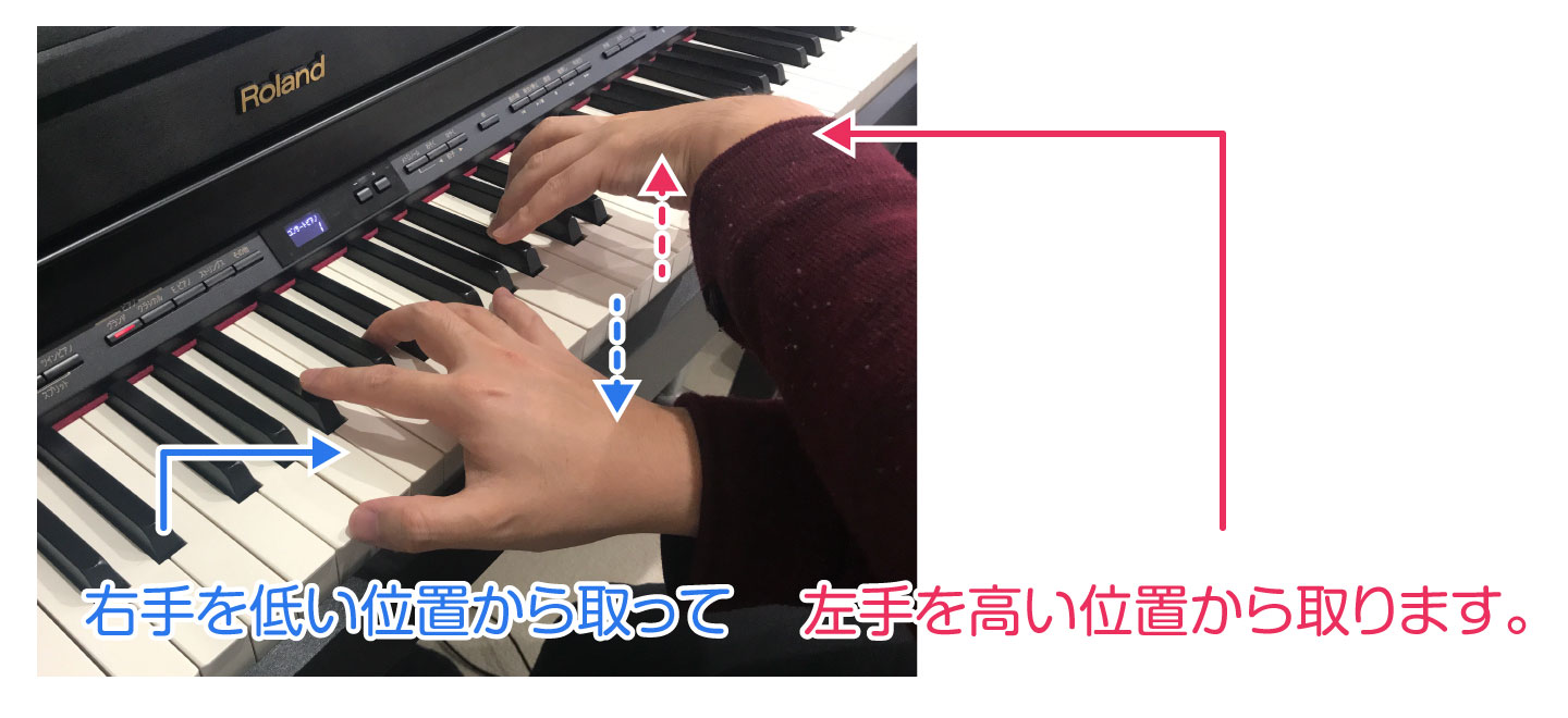 1. 交差は「左右の手の高さ」に注意しましょう。