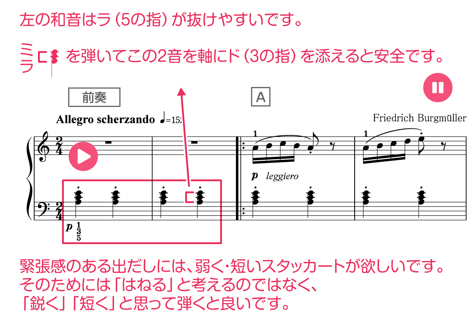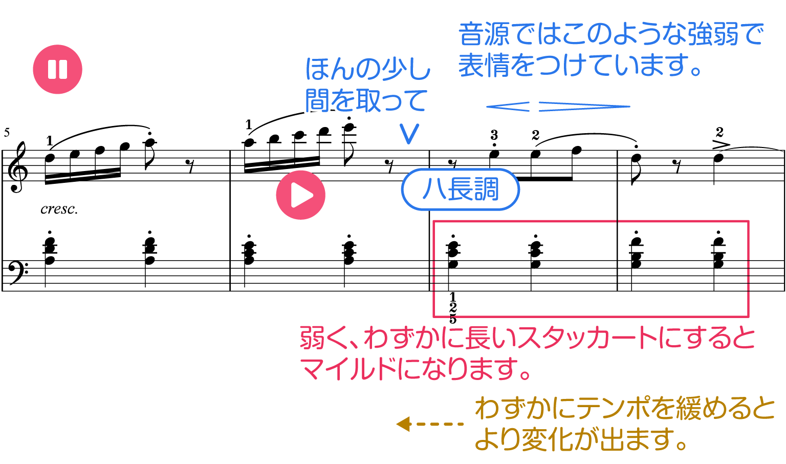 左のスタッカートは短く鋭く