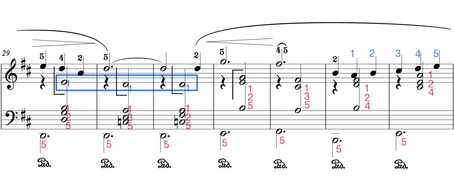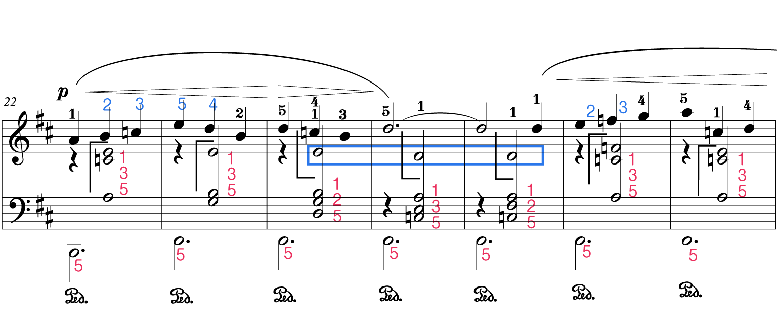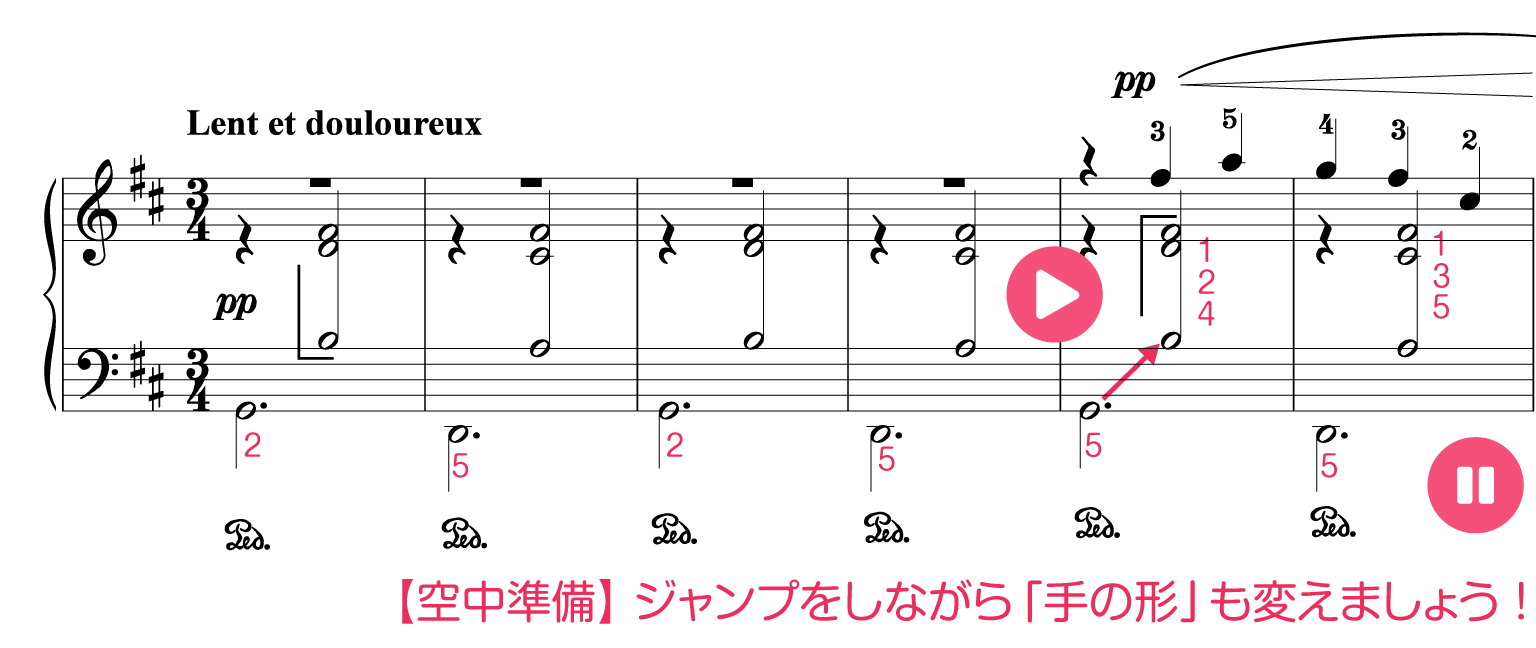 左手がト音記号までジャンプするので、座る位置(イスの位置)をいつもより後ろにした方が弾きやすいです。