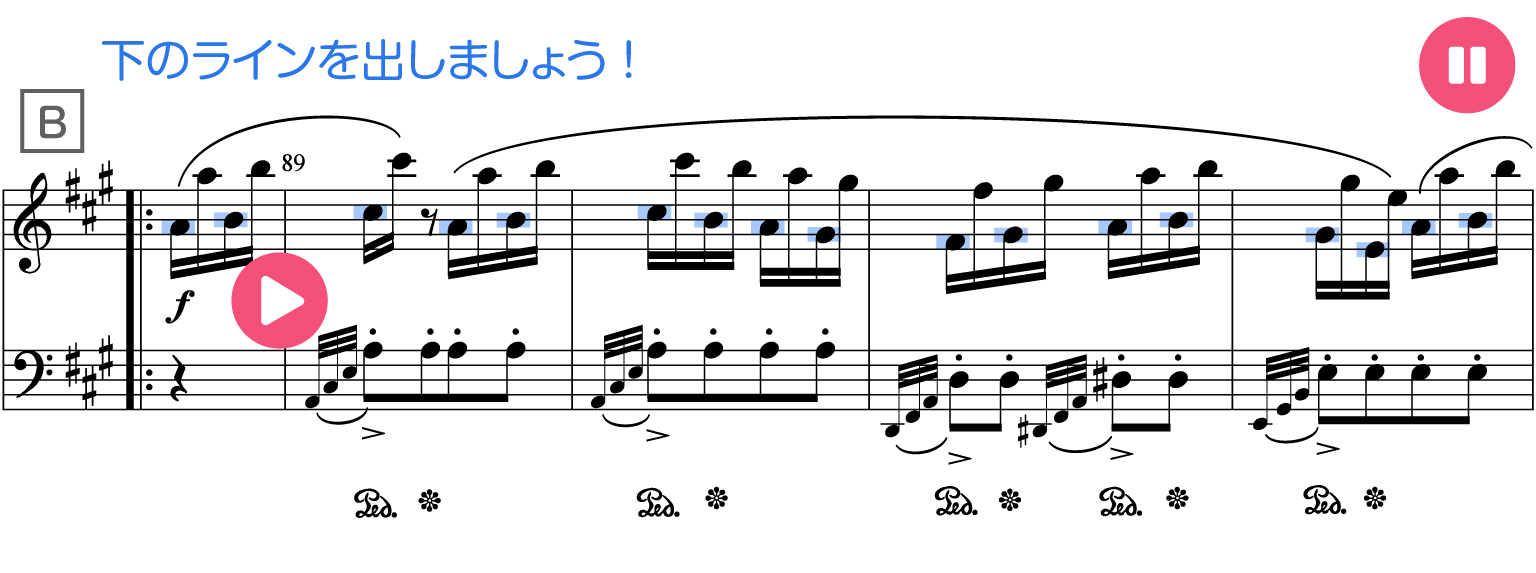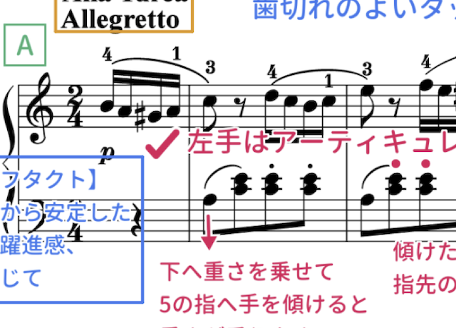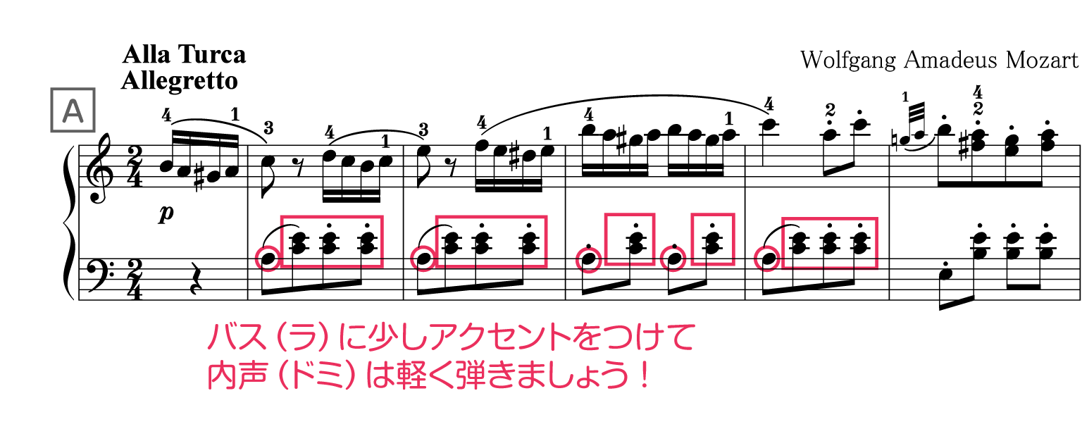 左手で躍動感を出すために、バスの音にほんの少しのアクセントをつけ、他の音を軽く(小さく・短く)弾きましょう!