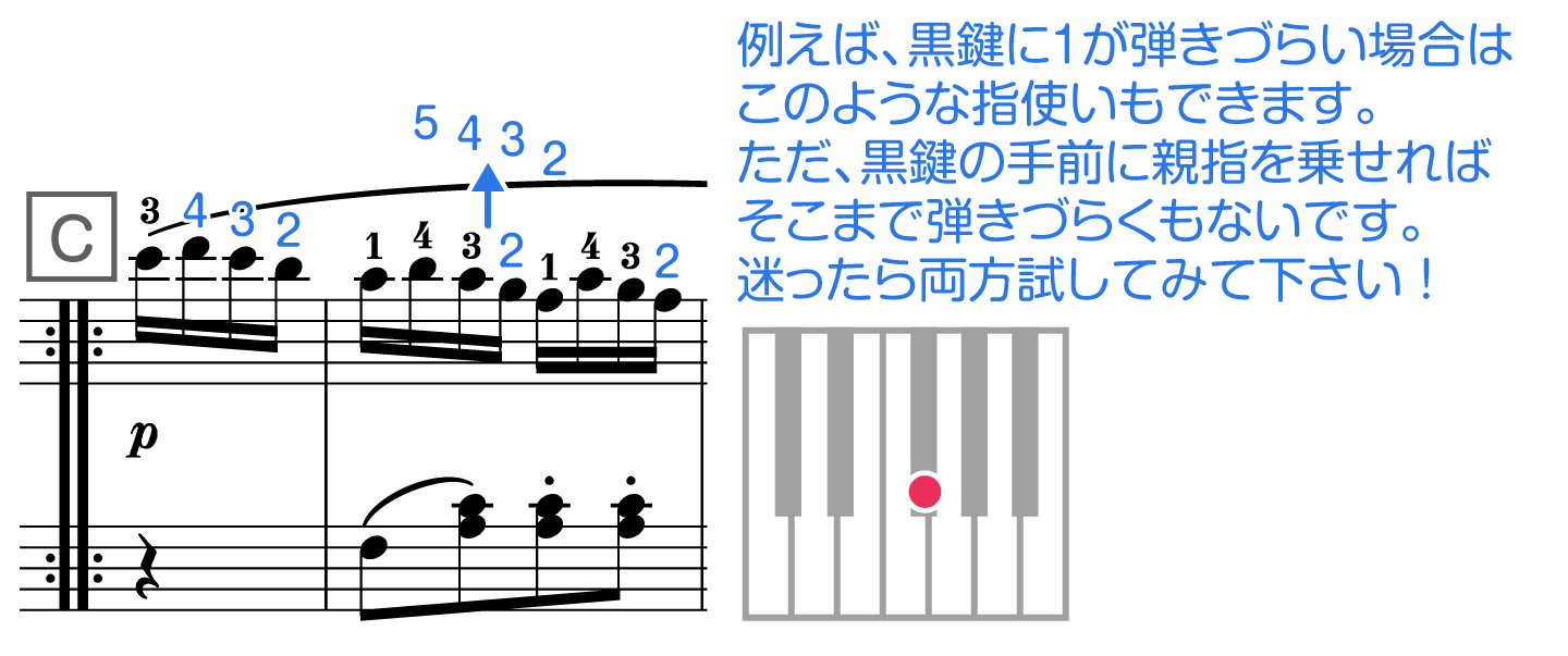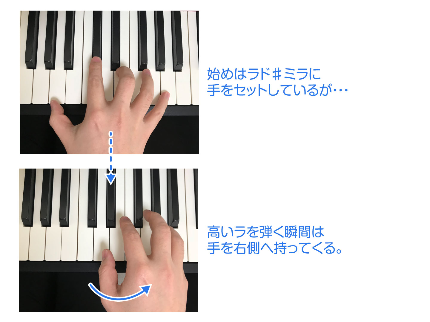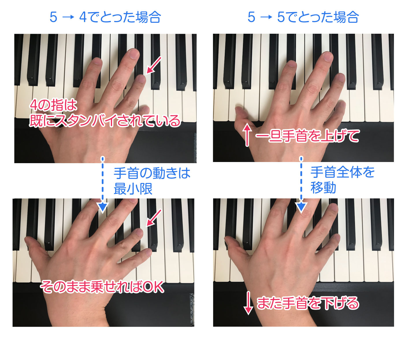 オクターブに4の指を使うメリットで紹介しましたが、こちらも4を使った方が手首の移動が少ないため外しにくくなります。