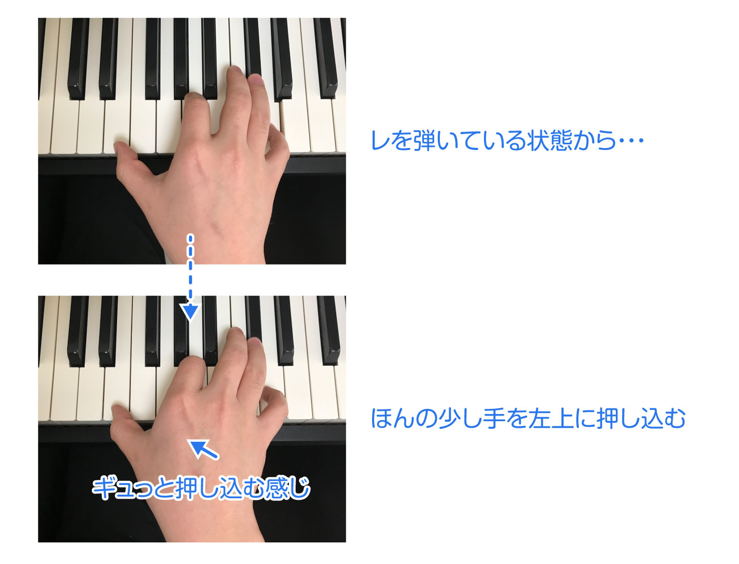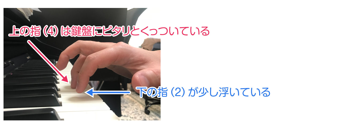 余裕があれば、指先を完全に揃えるのではなく、下の音の指を浮かせ、上の音の指だけが底まで打鍵されるようにしましょう。