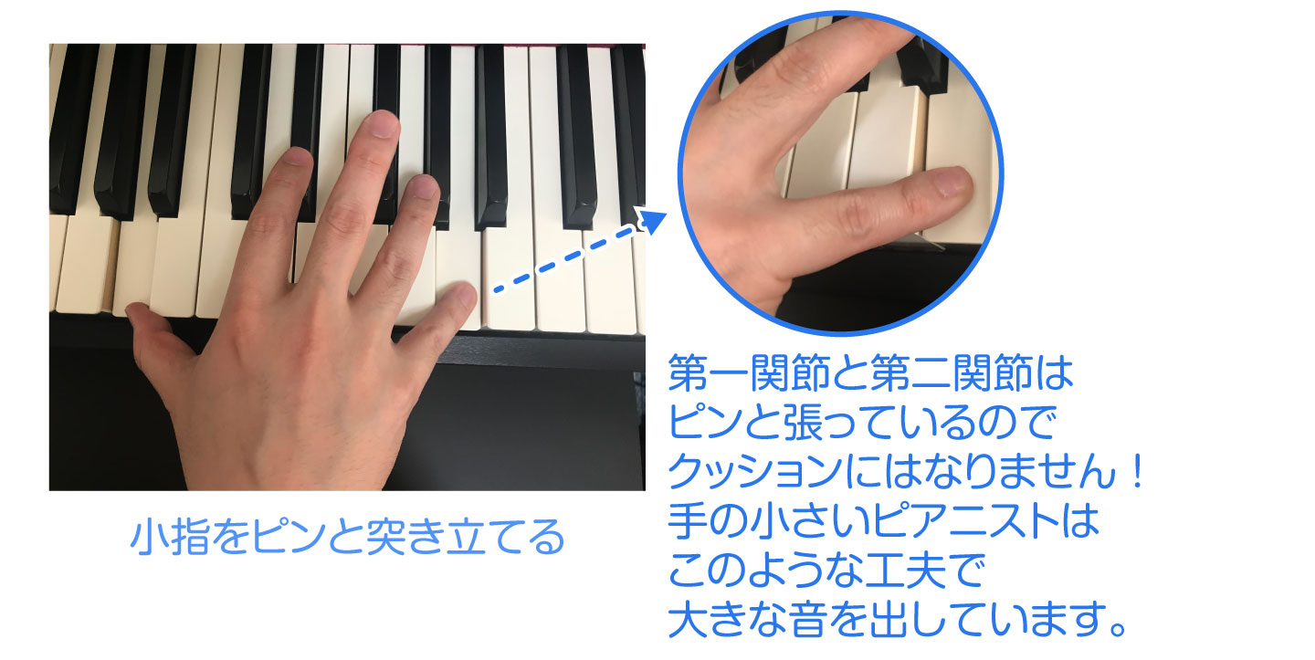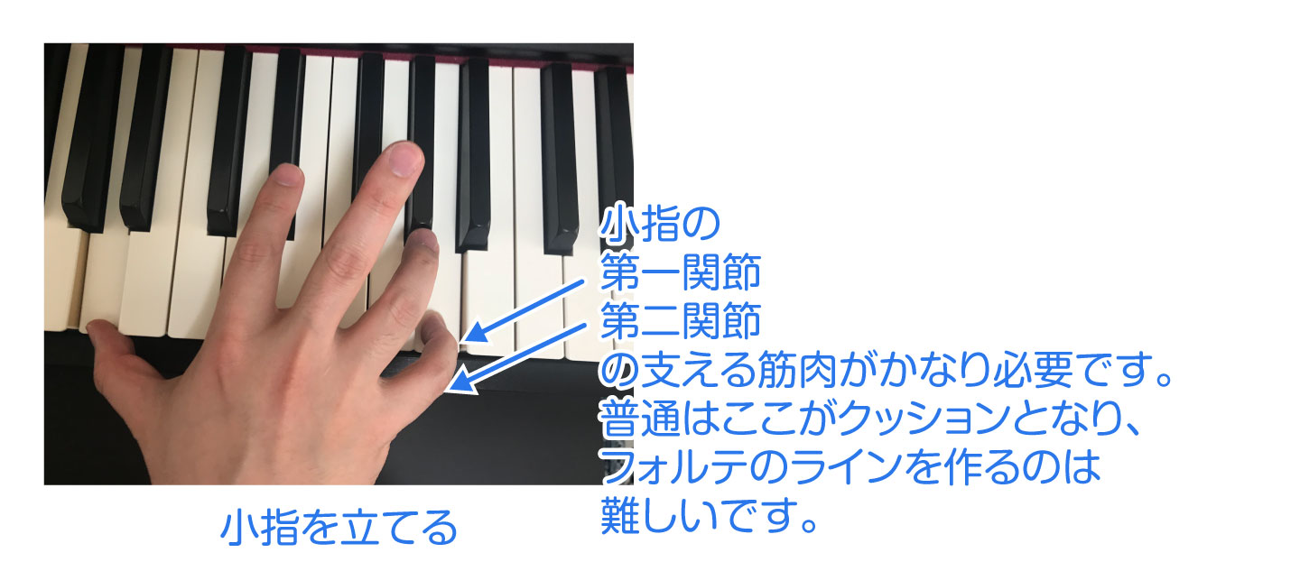 しかし、ふつうは小指の第一関節・第二関節はあまり強くないので、(クッションになってしまい)フォルテのラインを作るのが難しい場合もあります。