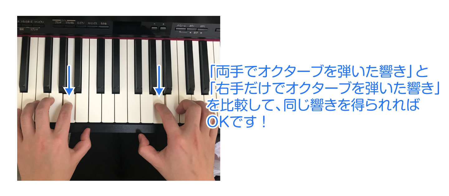「両手でオクターブを弾いた響き」(このとき高い音を強めに出すこと)と「右手だけでオクターブを弾いた響き」を比較して、同じ響きを得られればOKです!