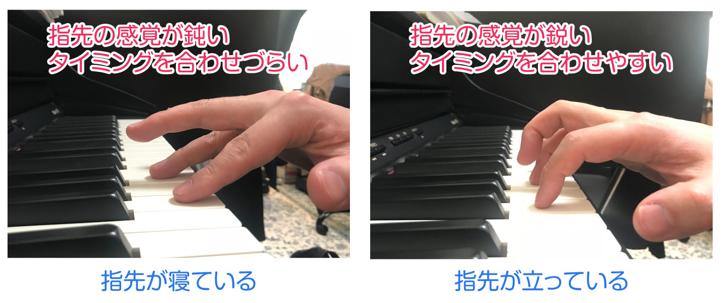 指先が寝ていると和音を同時に鳴らせないことがあるので、指を立てて(目的は鍵盤にあたる指先の感覚を鋭く感じることです!)弾きましょう。