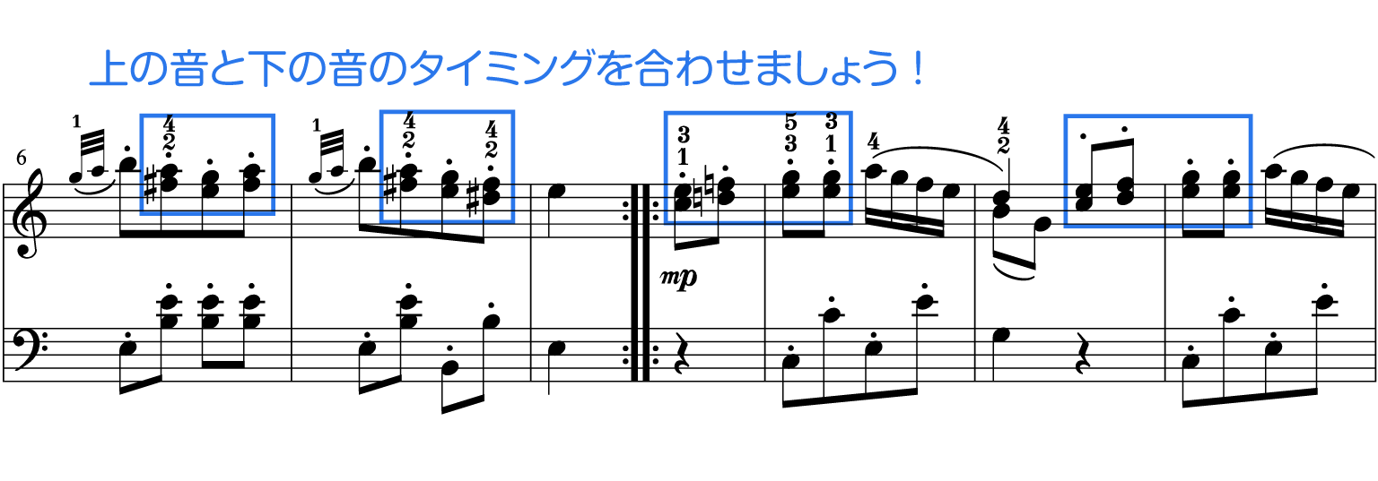 「指を下げる」『打鍵』(だけん)だけでなく、ここでは「指を上げる」『離鍵』(りけん)も意識しましょう!