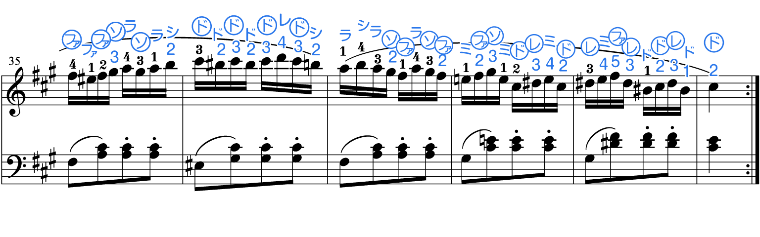 - 54・45の指替えによるレガート(ここはスタッカートなので関係ありません。)