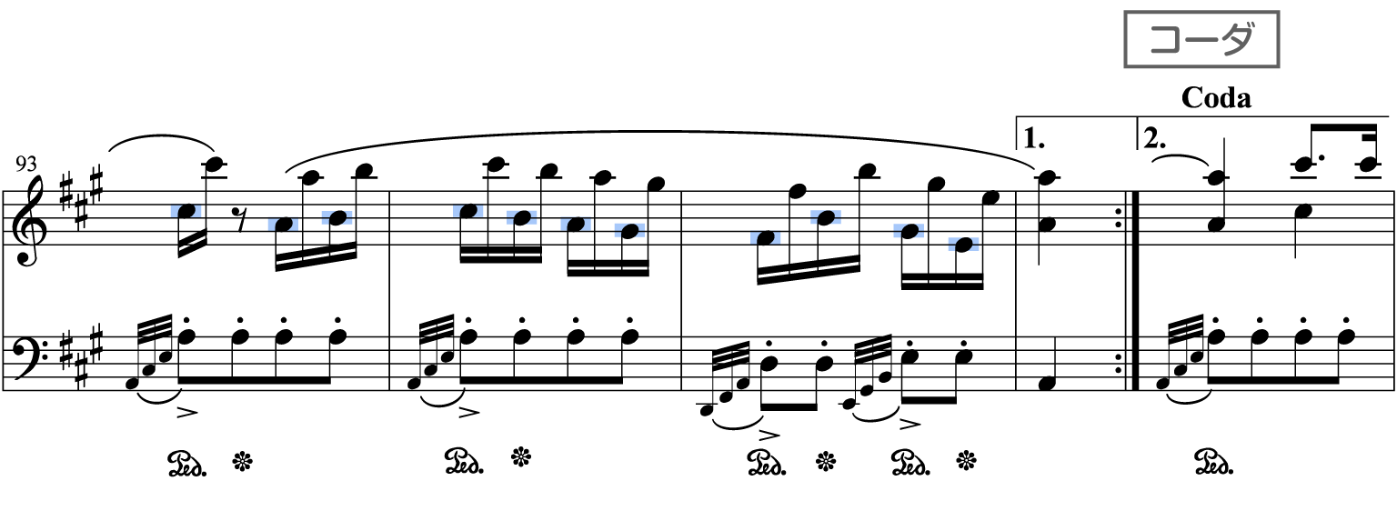 前半の「ラ・シ・ド#ー」の部分は、上の音を輝かしく出すと言いましたが、 ここは上の音が裏拍になってしまうので、下の音でラインを作るのが自然です。