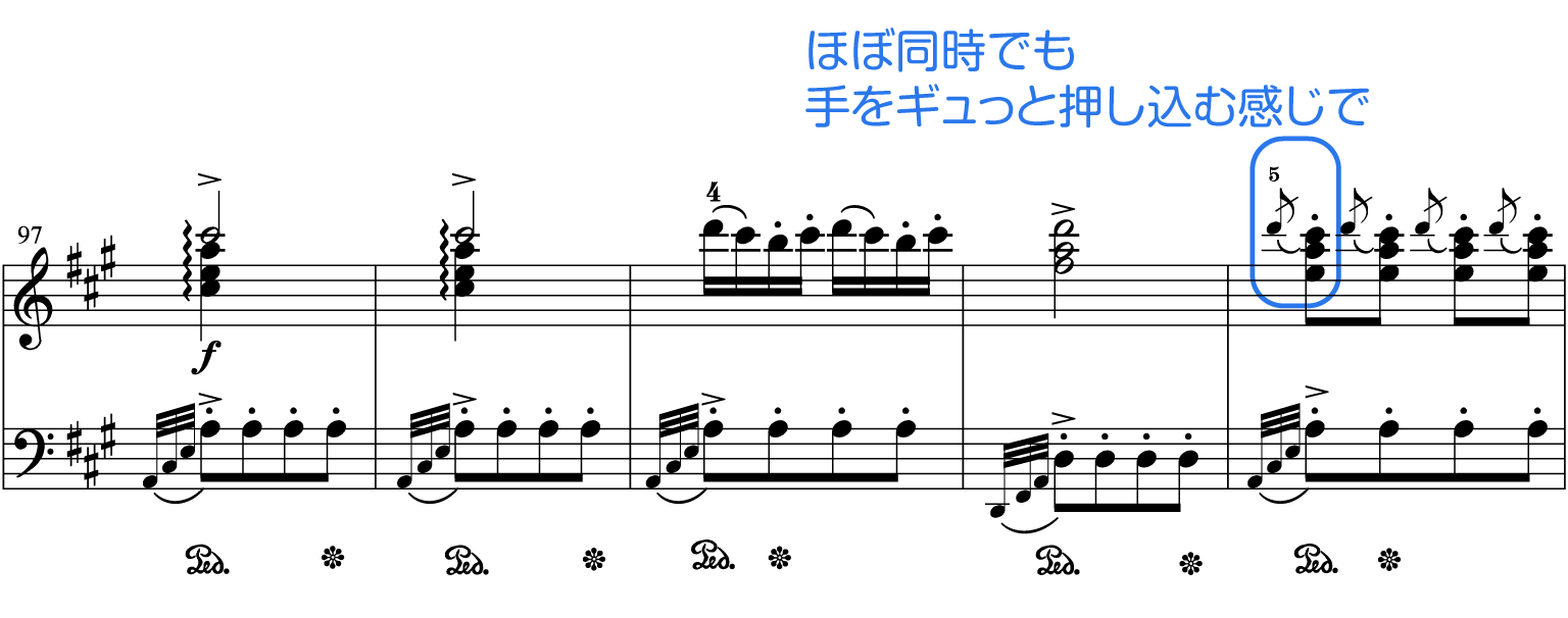 5. 難しい装飾音はほぼ同時でも。手をギュっと押し込む感じで