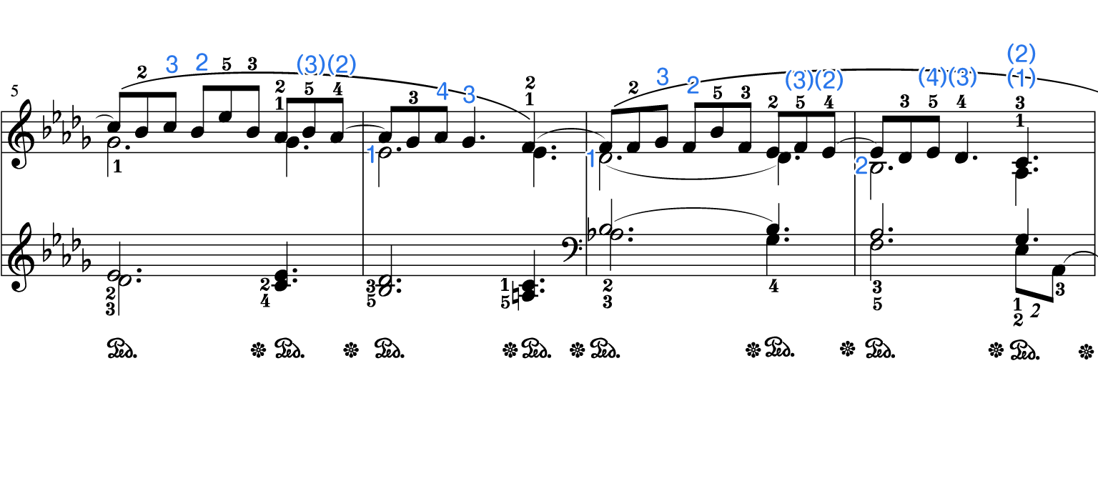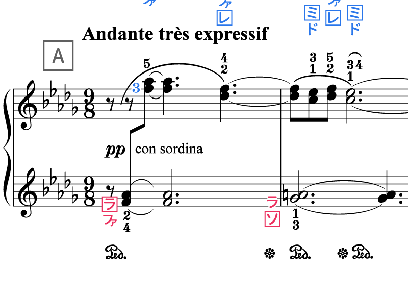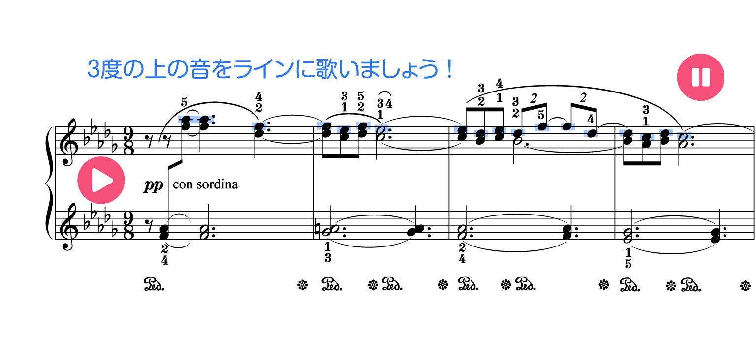 楽譜には右手の3度を両方レガートできる指番号をふりました。