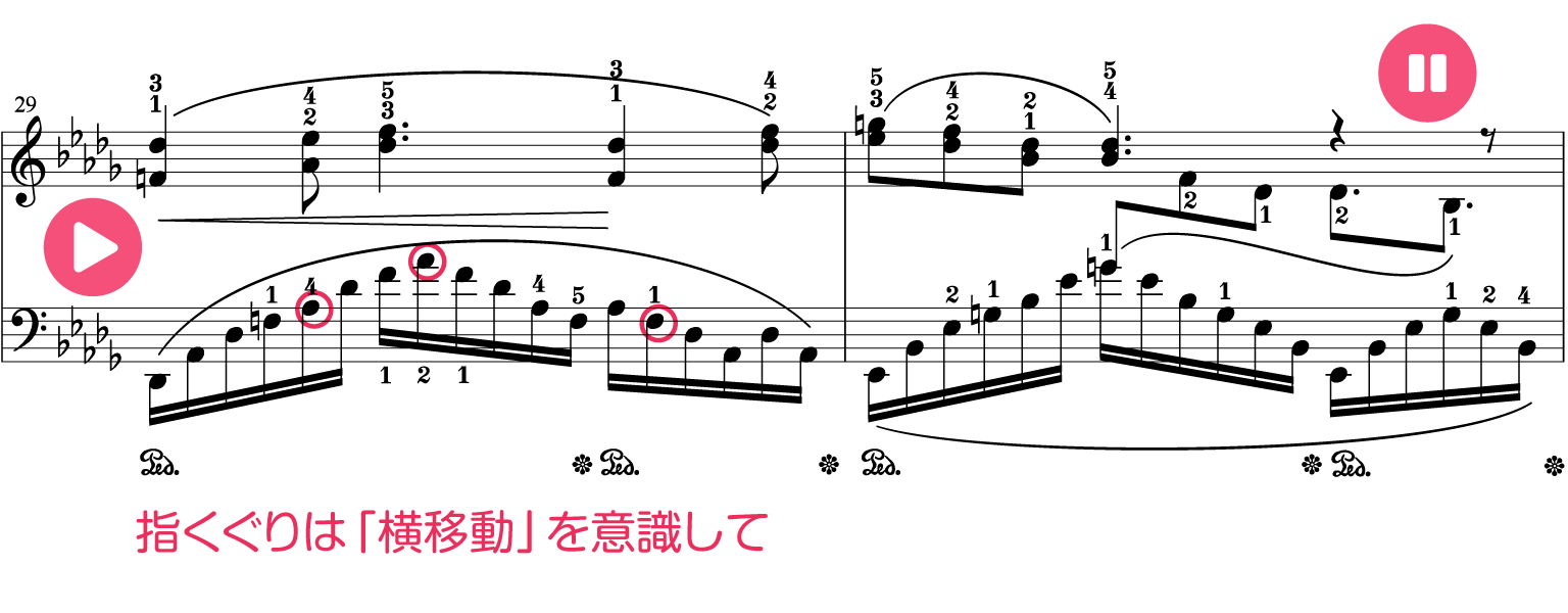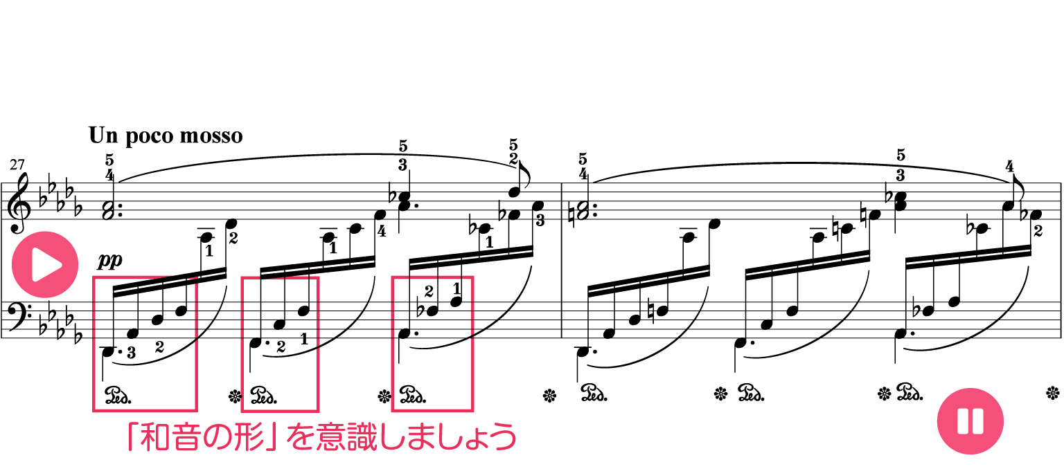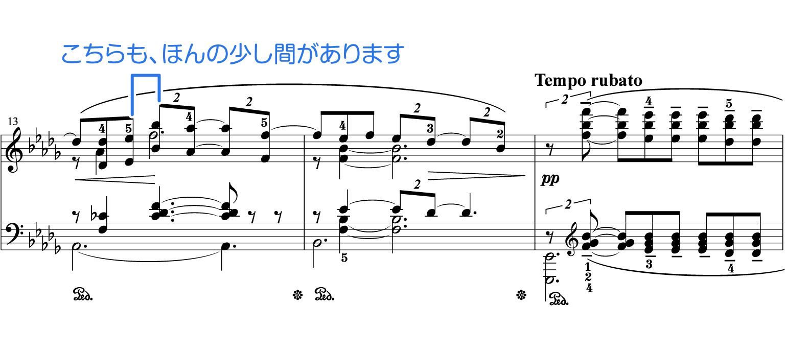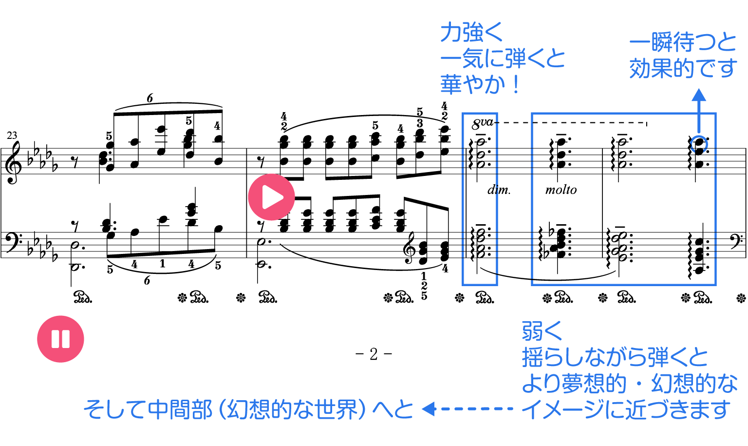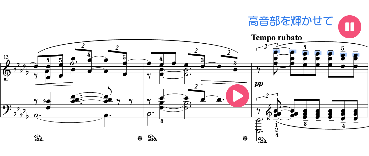 楽譜上では、アルペジオのスピードについて書かれていませんが、 力強く一気に弾くと『華やか』、弱く・揺らしながらだと『幻想的』なイメージになります。