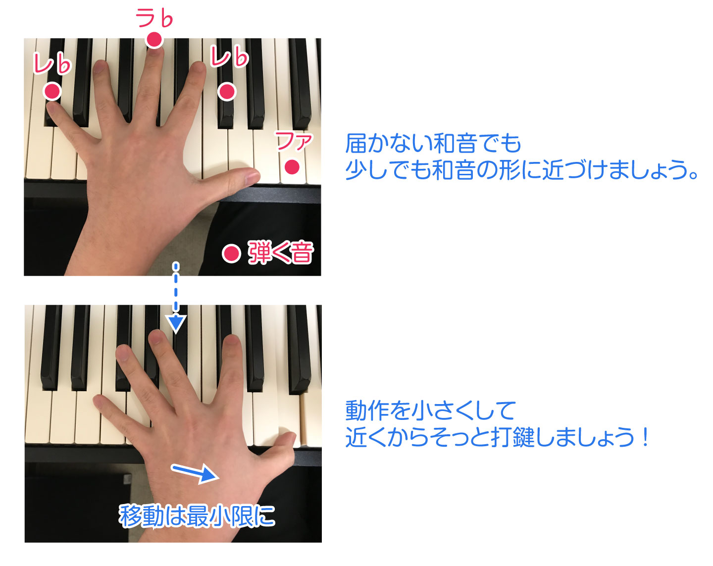 左は「和音の形」を作り、動作を小さくして近くからそっと打鍵しましょう。