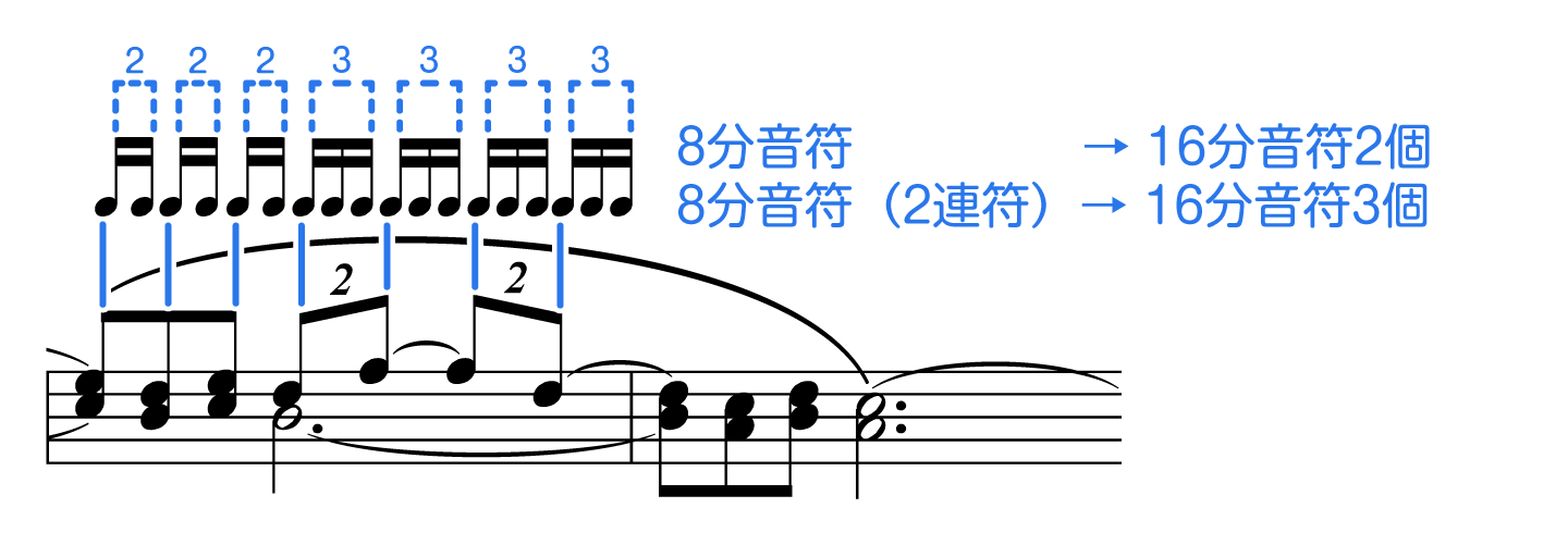 曲中によく出てくる2連符は16分音符でカウントすると分かりやすいです。