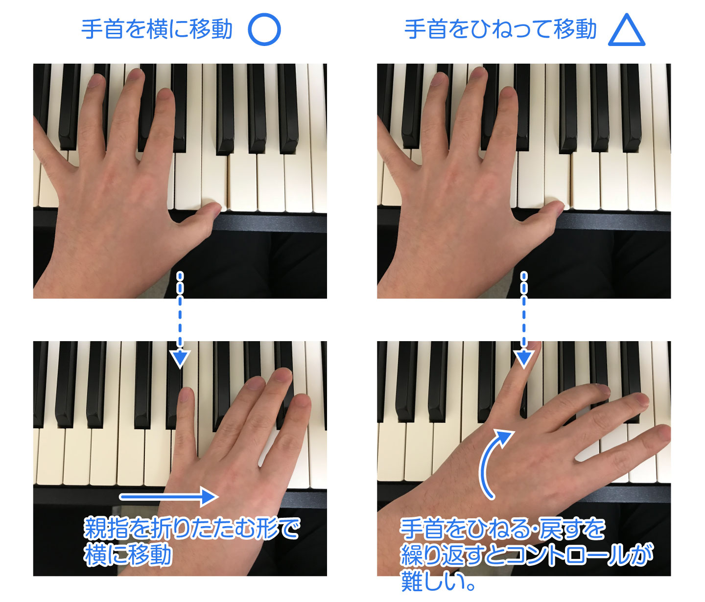 指くぐりする時に手首を「上げ下げ」したり「ひねったり戻したり」すると、アクセントがついてしまったり、音量がコントロールしづらくなります。