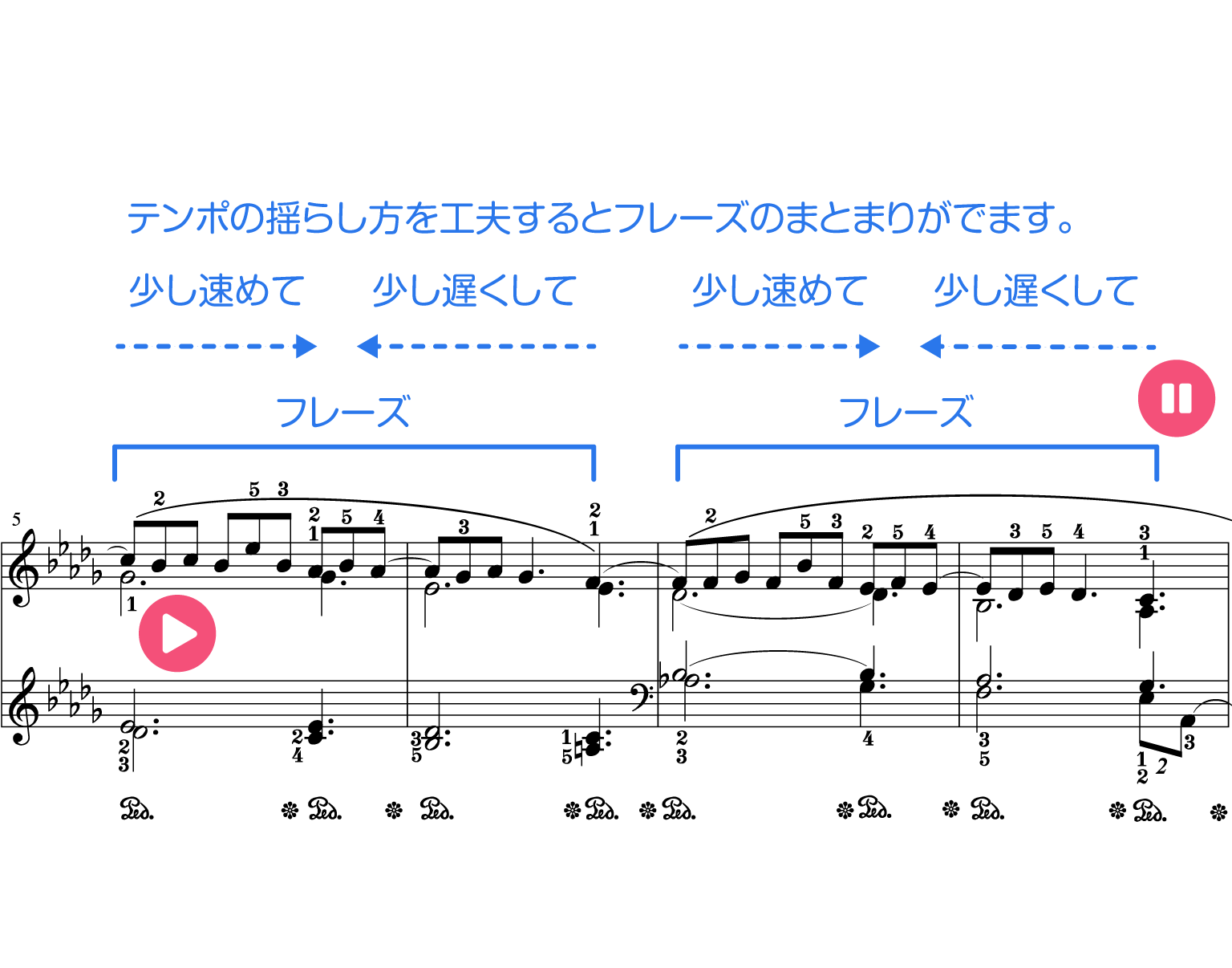1フレーズ、1フレーズだけでなく、頂点に向かってどのようにドラマを作るか、「長い息」での強弱やテンポの揺らし方を考えてみましょう!
