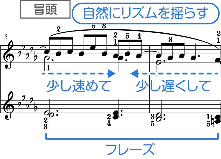 フレーズの最初は「ゆっくり」、だんだん速めて、最後はまた「ゆっくり」が基本です。