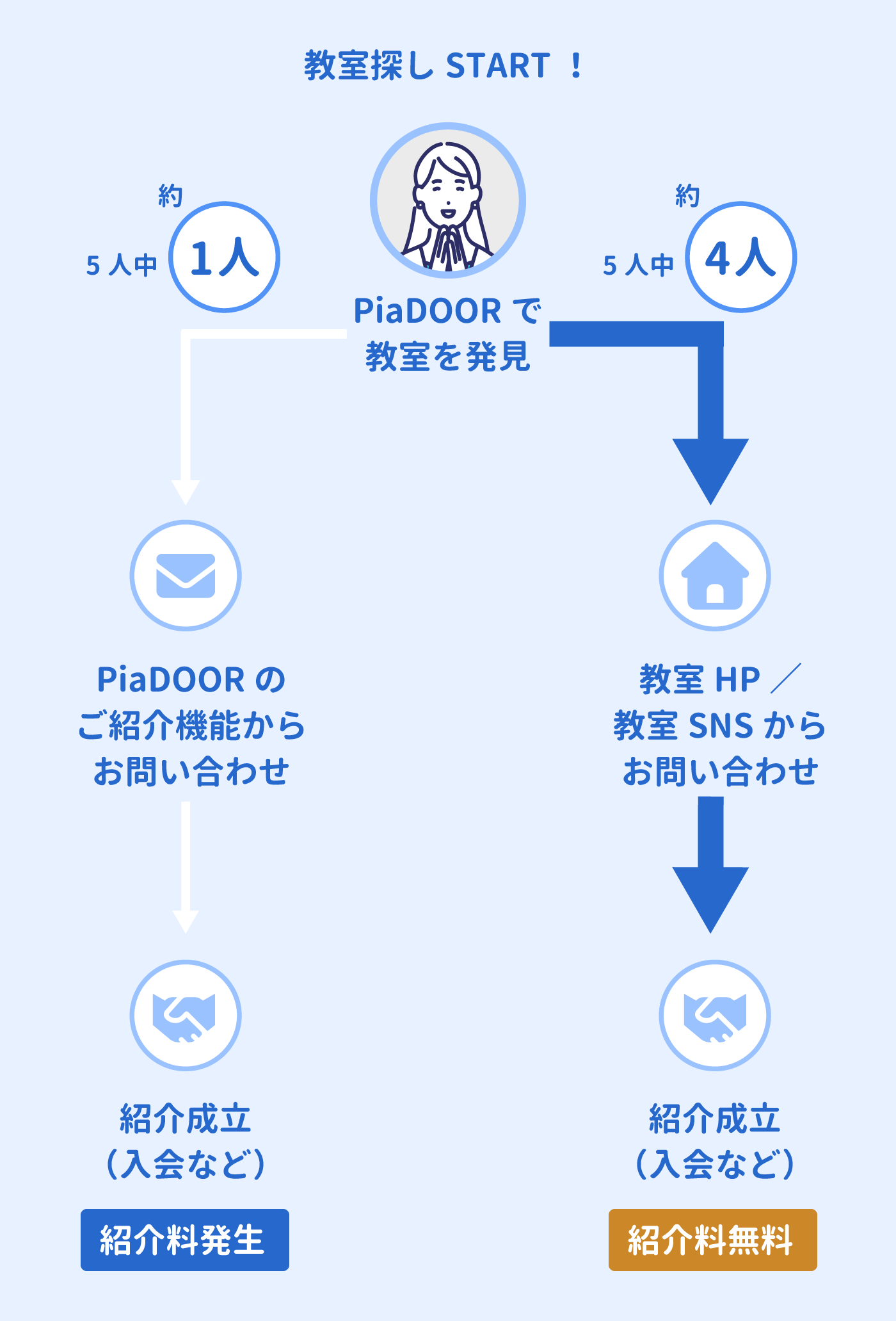 PiaDOORからHPやSNSへの直接アクセスなどの場合は基本的にはご紹介料はいただいておりませんが、その生徒様が【PiaDOORのご紹介機能】も併用した場合はご紹介料が発生する場合があります。 これはPiaDOOR側でご紹介経路を調査できない場合があるためです。