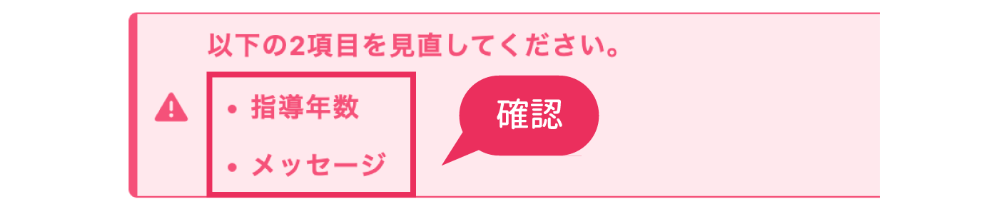 「指導年数」や「教室写真」が未登録の場合などにエラーが表示されます。