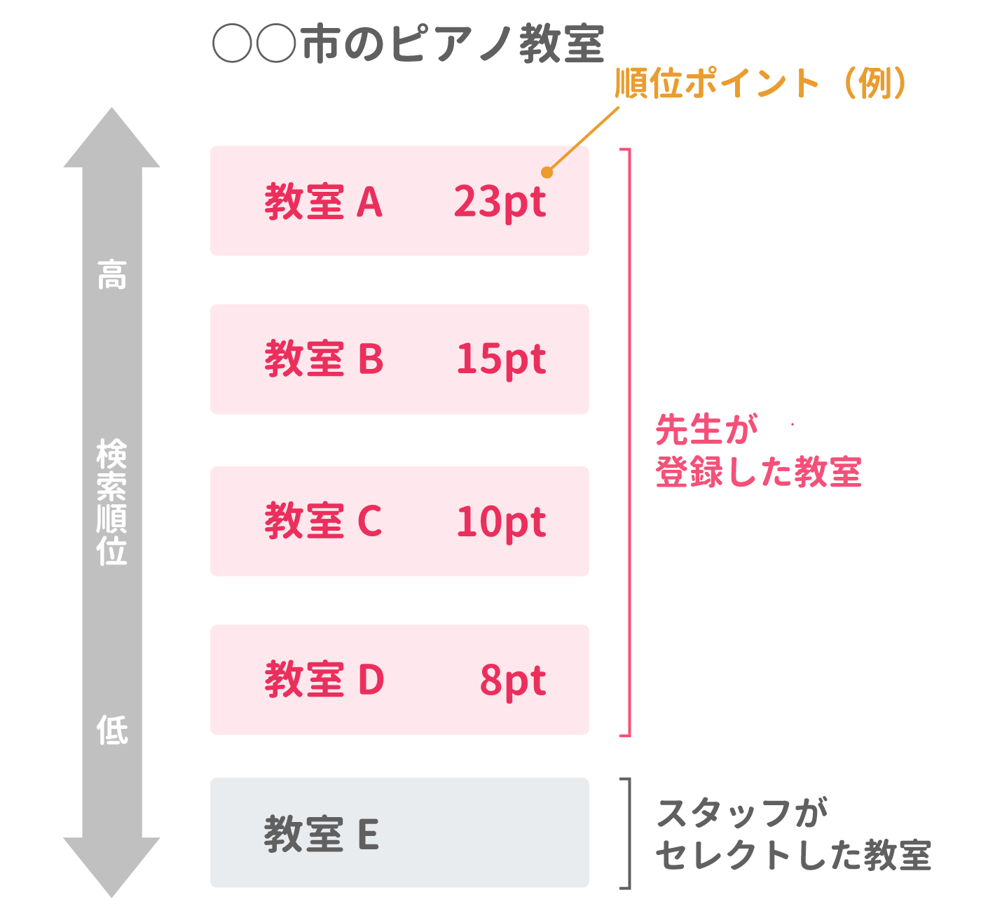指導者会員の教室は、順位ポイントに関わらず、ライトユーザーより上位に表示されます。(2教室目以降もライトユーザーより上位に表示されます。)
