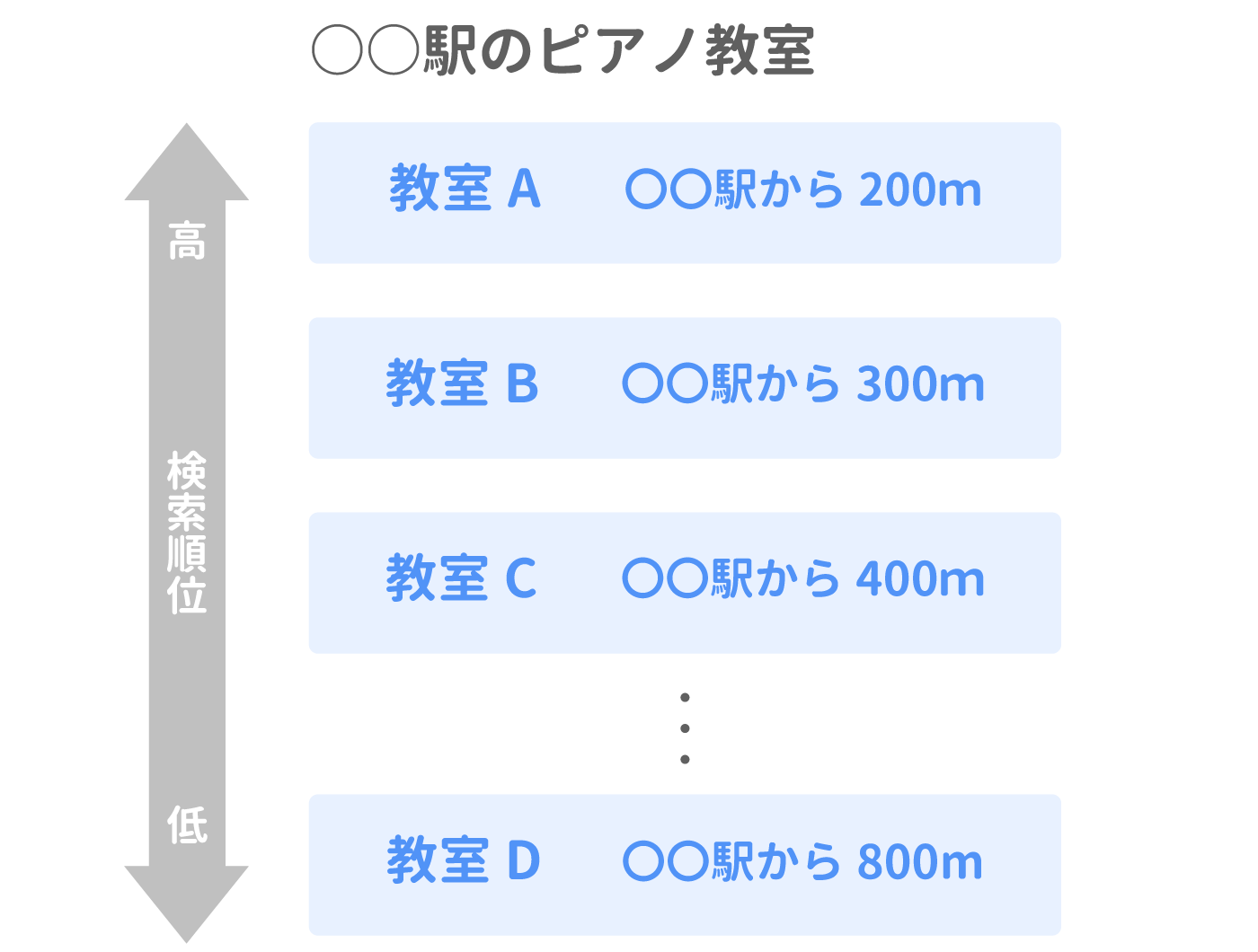 指導者会員の教室は、駅からの距離を自動的に半分として計算するため、検索結果で上位に表示されやすくなります。 【例】75mの無料会員の教室よりも、100mの指導者会員の教室の方が上位表示されます。